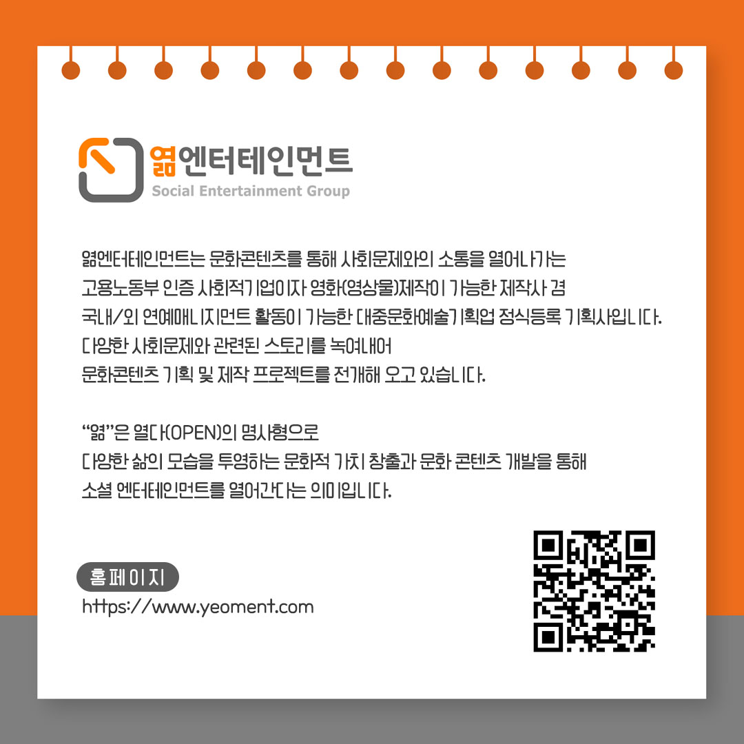 엶엔터테인먼트는 문화콘텐츠를 통해 사회문제와의 소통을 열어나가는 고용노동부 인증 사회적기업이자 영화(영상물)제작이 가능한 제작사 겸 국내/외 연예매니지먼트 활동이 가능한 대중문화예술기획업 정식등록 기획사입니다. 다양한 사회문제와 관련된 스토리를 녹여내어 문화콘텐츠 기획 및 제작 프로젝트를 전개해 오고 있습니다. “엶”은 열다(OPEN)의 명사형으로 다양한 삶의 모습을 투영하는 문화적 가치 창출과 문화 콘텐츠 개발을 통해 소셜 엔터테인먼트를 열어간다는 의미입니다.